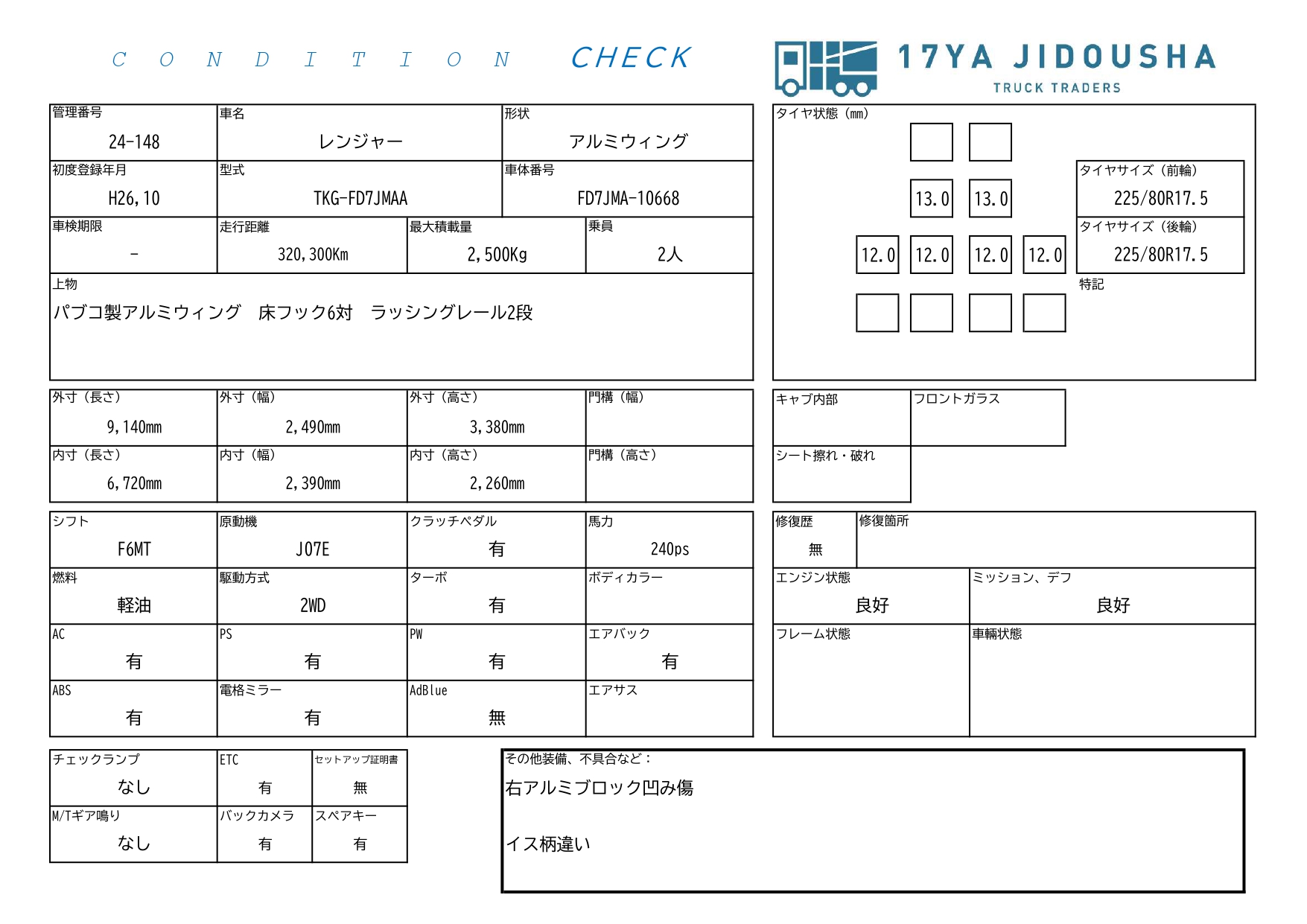 | 架装特記事項 | パブコ製アルミウィング 床フック6対 ラッシングレール2段 |