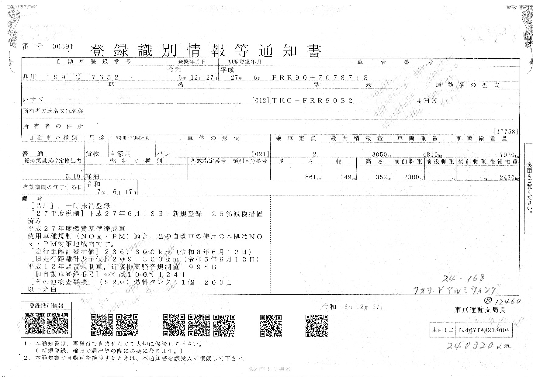 [24-168]H27年フォワードアルミウィング 3,05t 24万㎞ TKG-FRR90S2