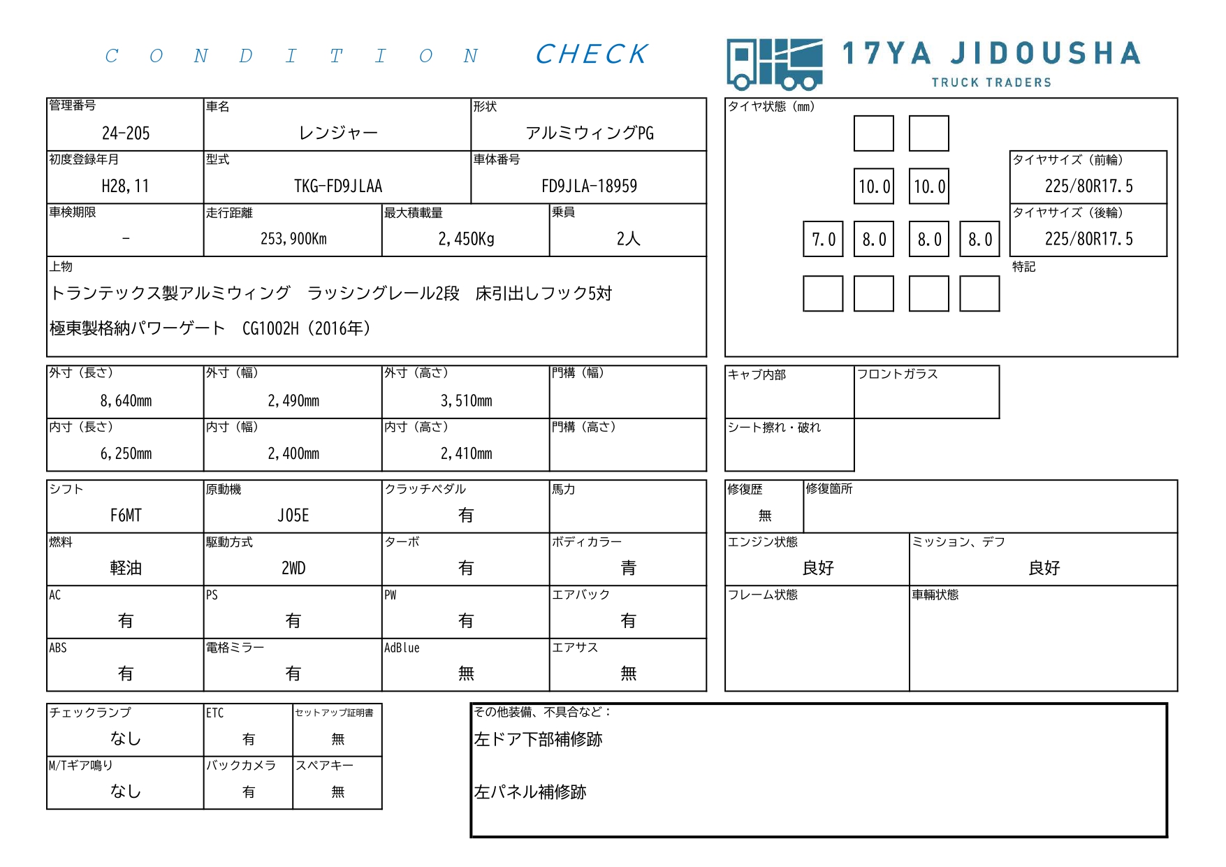 | 架装特記事項 | トランテックス製アルミウィング 極東製格納式パワーゲートCG1002H(16年) ラッシングレール2段 床引出フック5対 |