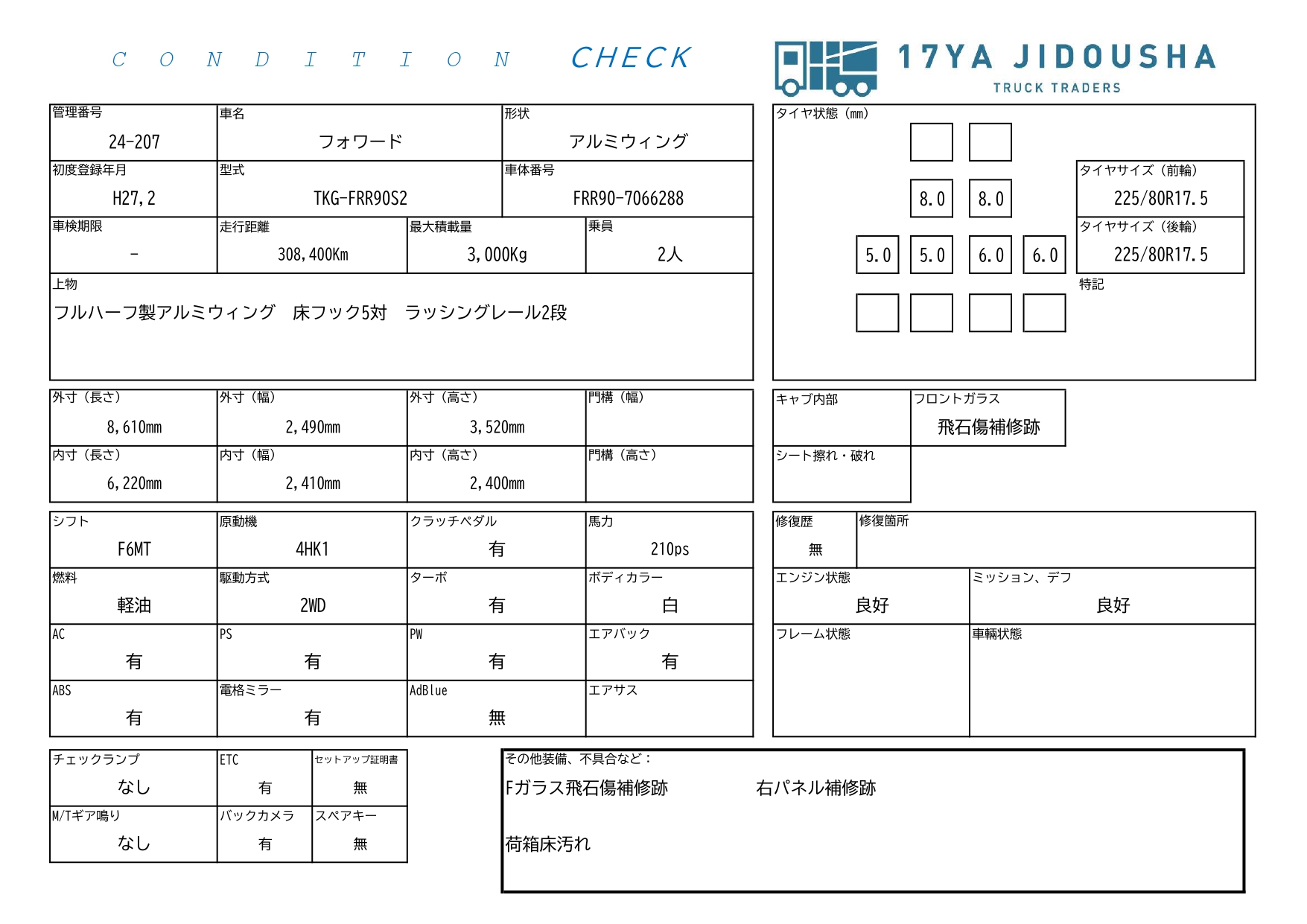 | 架装特記事項 | 日本フルハーフ製アルミウイング 床フック5対 ラッシングレール2段 |