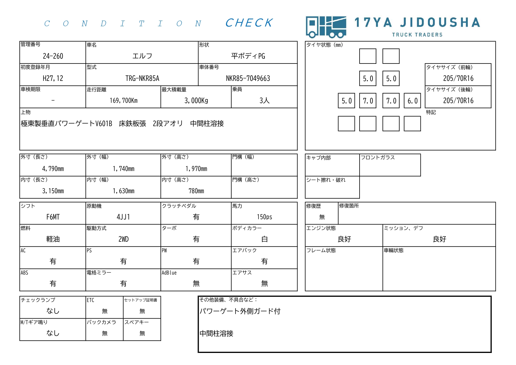 | 架装特記事項 | 極東開発工業製垂直パワーゲートV601B 床鉄板張 2段あおり 中間柱溶接 |