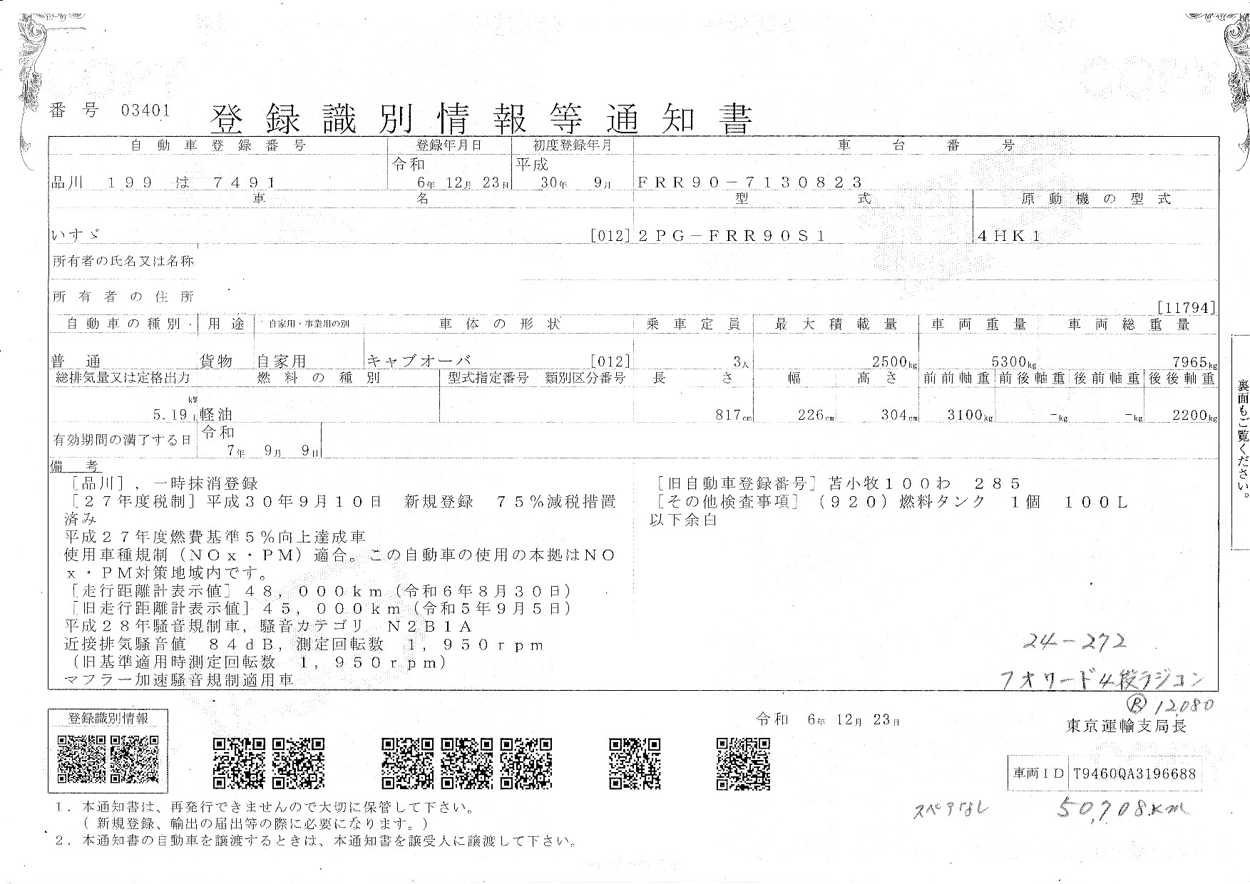 | 架装特記事項 | 古河ユニック製4段クレーンフックインURG344(18/07) ラジコン付 ロープ通し穴3対 床フック4対 |