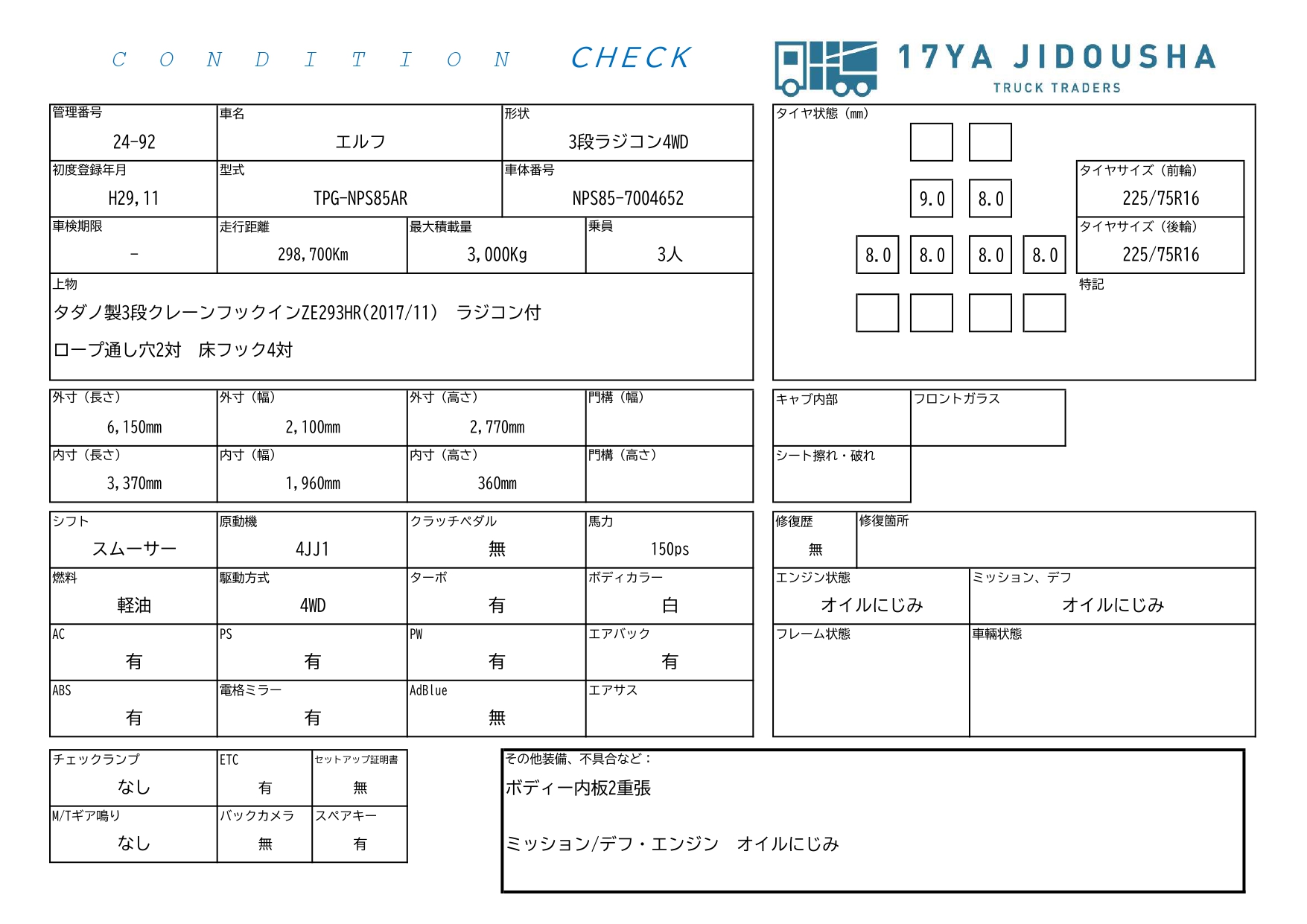 架装特記事項 | タダノ製3段クレーンフックインZE293HR(11/17) ラジコン付 ロープ通し穴2対 床フック4対 |