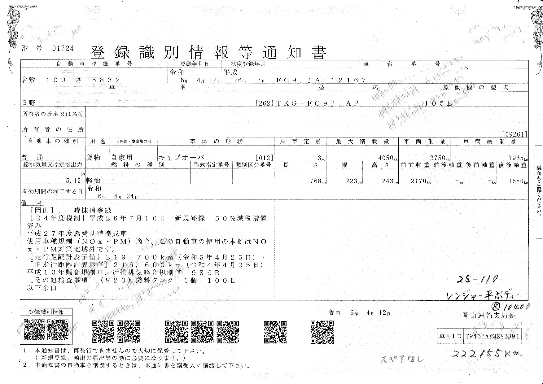 | 車検満了日 | 一時抹消 |
