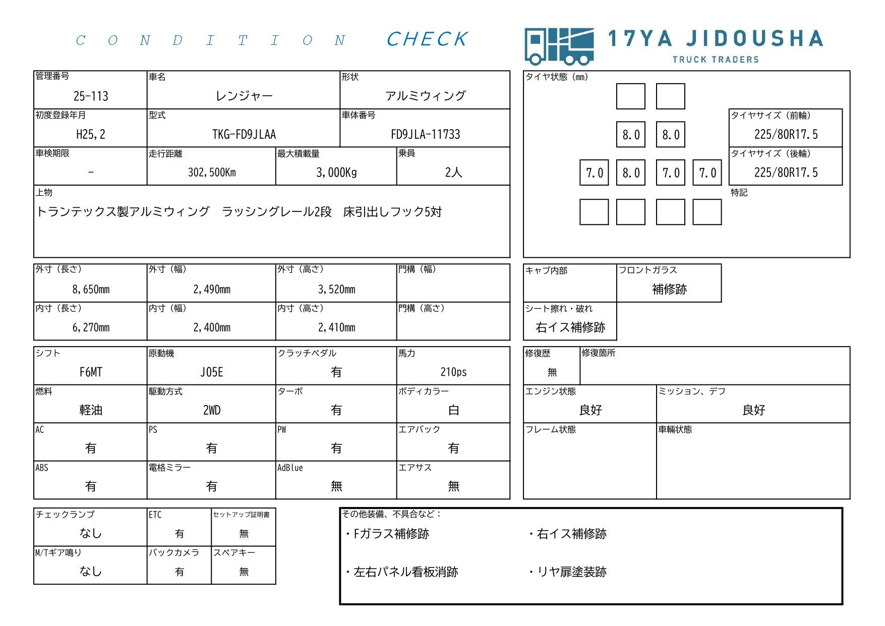 | 架装特記事項 | トランテックス製アルミウイング ラッシングレール2段 床引出フック5対 |