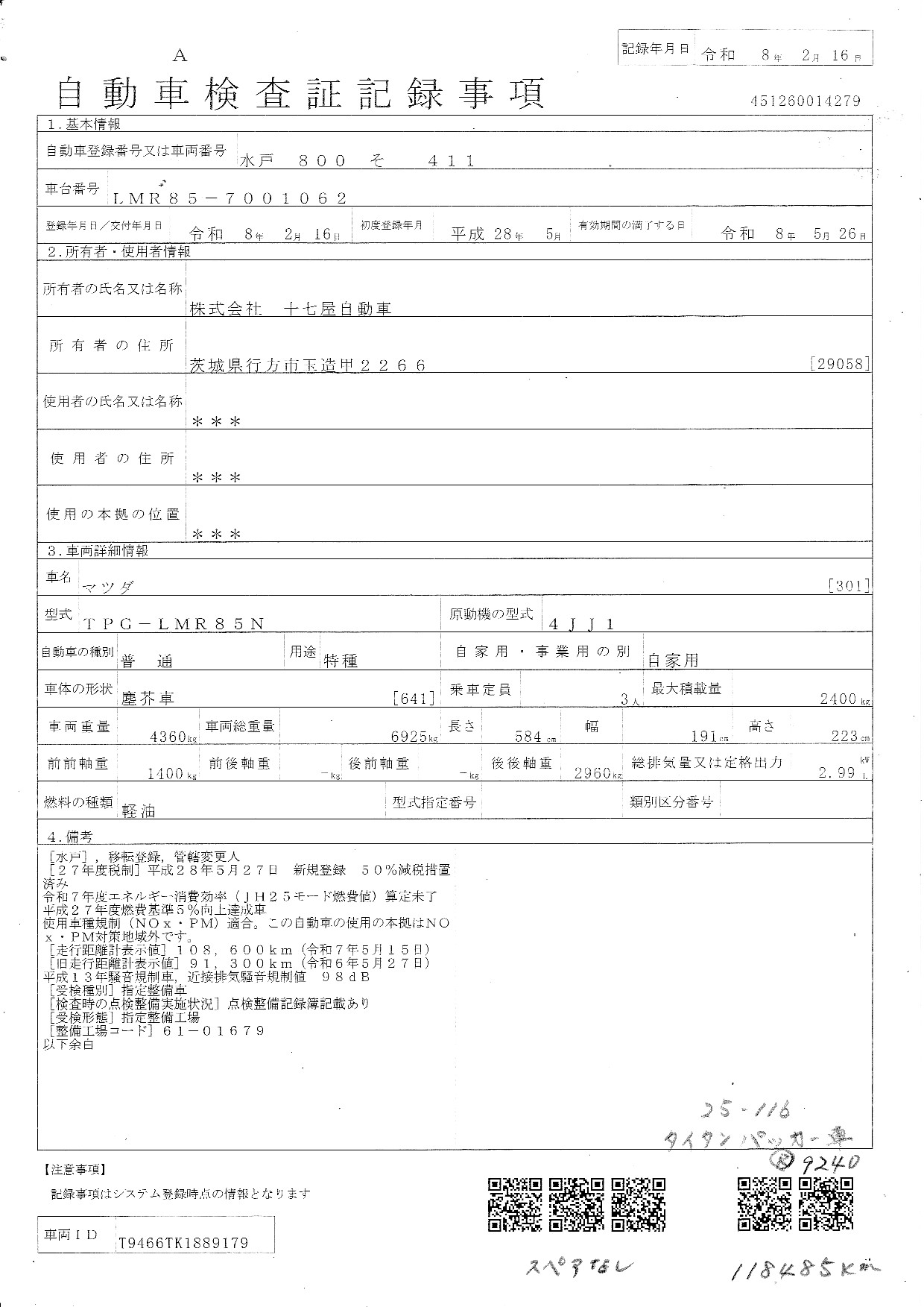 | 車検満了日 | 令和8年5月26日迄 |