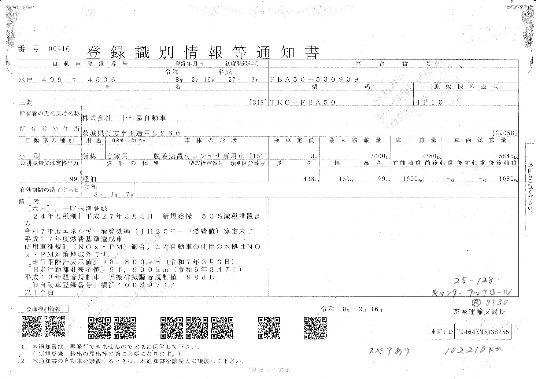 | 車検満了日 | 一時抹消 |