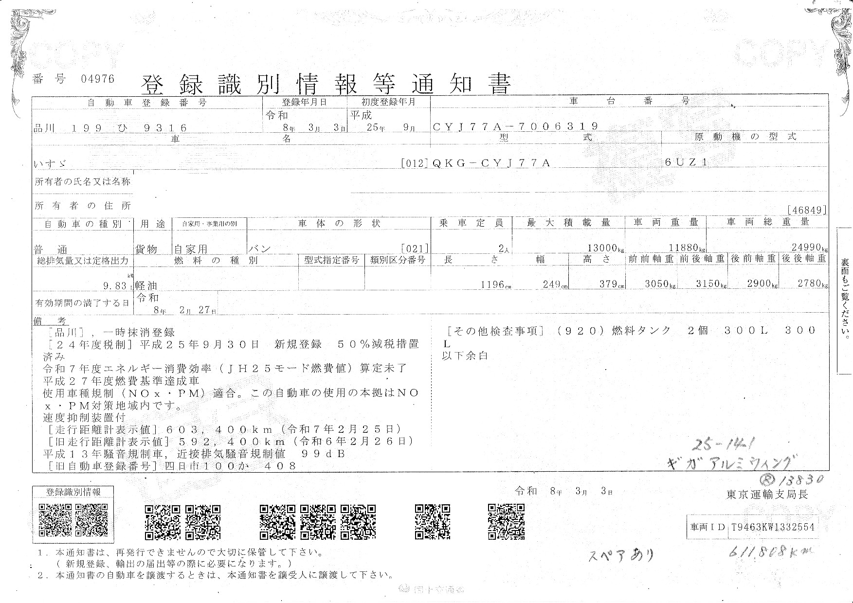 | 車検満了日 | 一時抹消 |