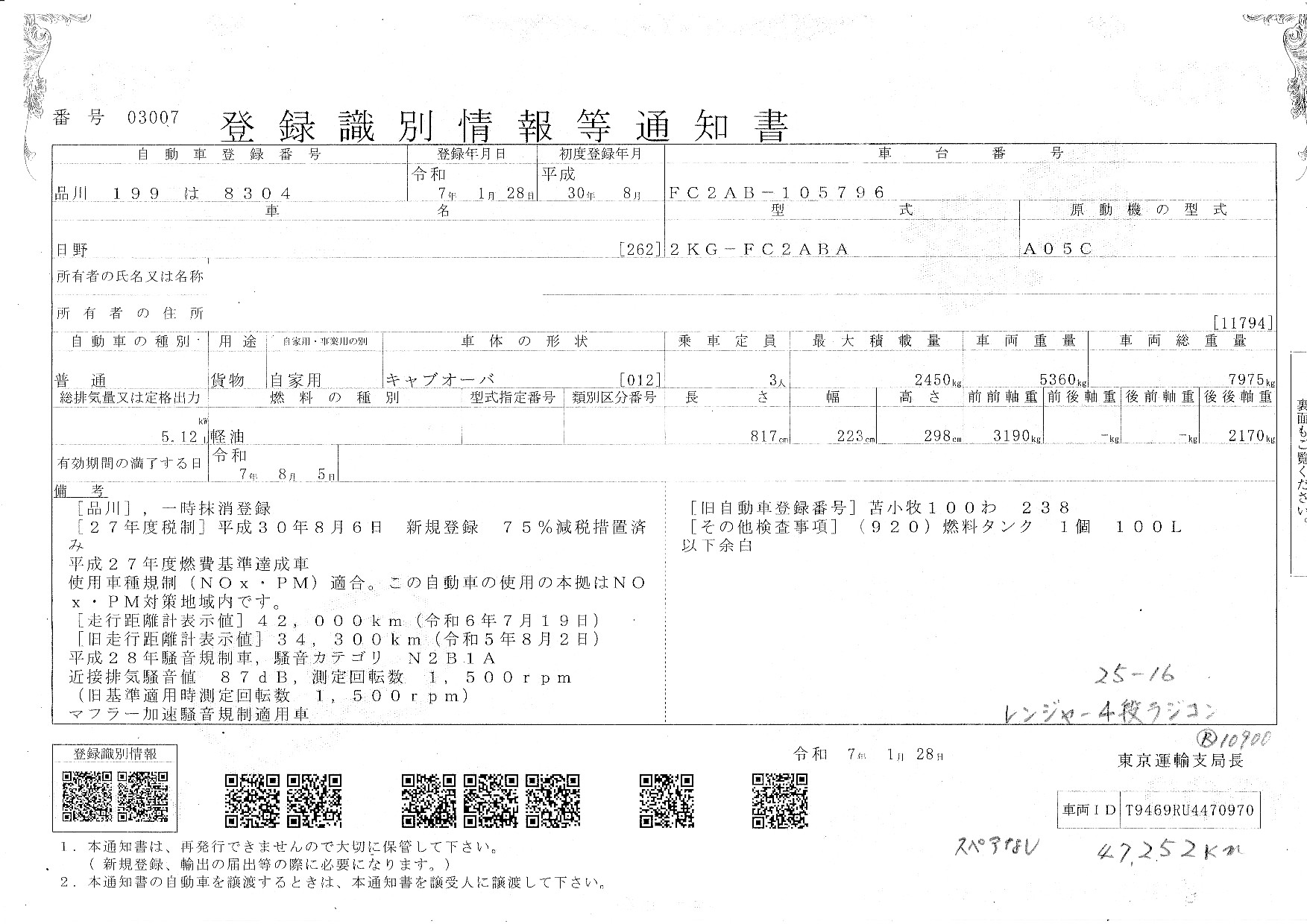 | 車検満了日 | 一時抹消 |