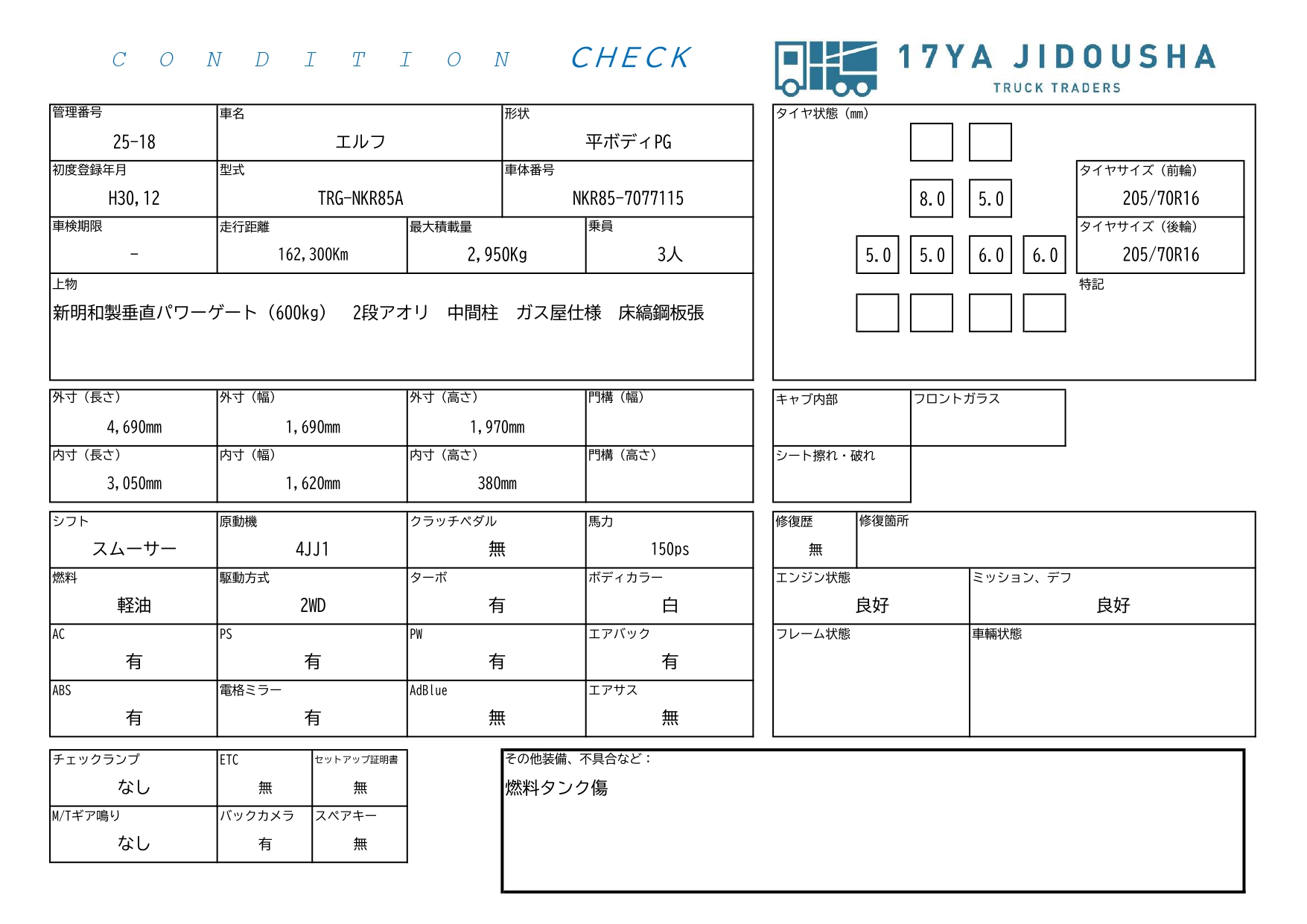 | 架装特記事項 | 新明和工業製垂直パワーゲート(600㎏) 2段煽り 中間柱 ガス屋仕様 縞鋼板張 |