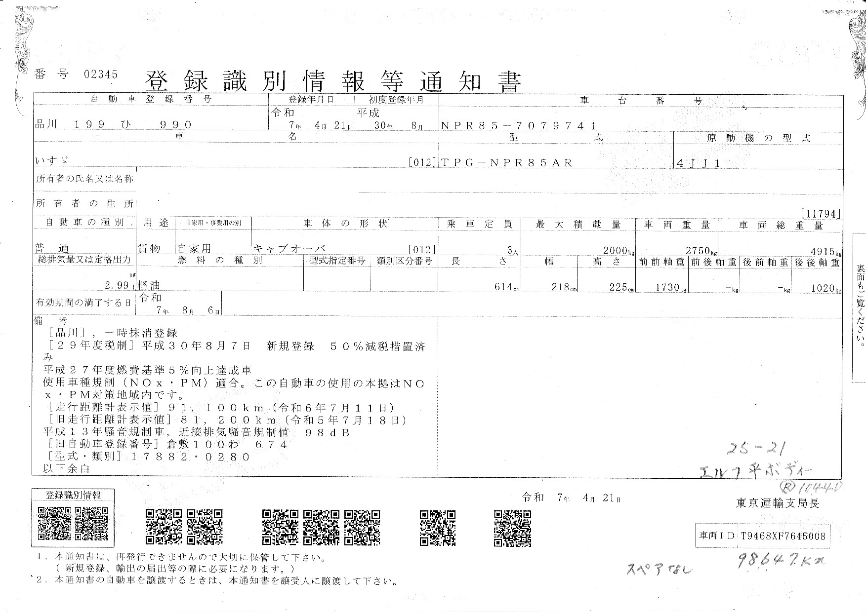| 車台番号 | NPR85-7079741 |