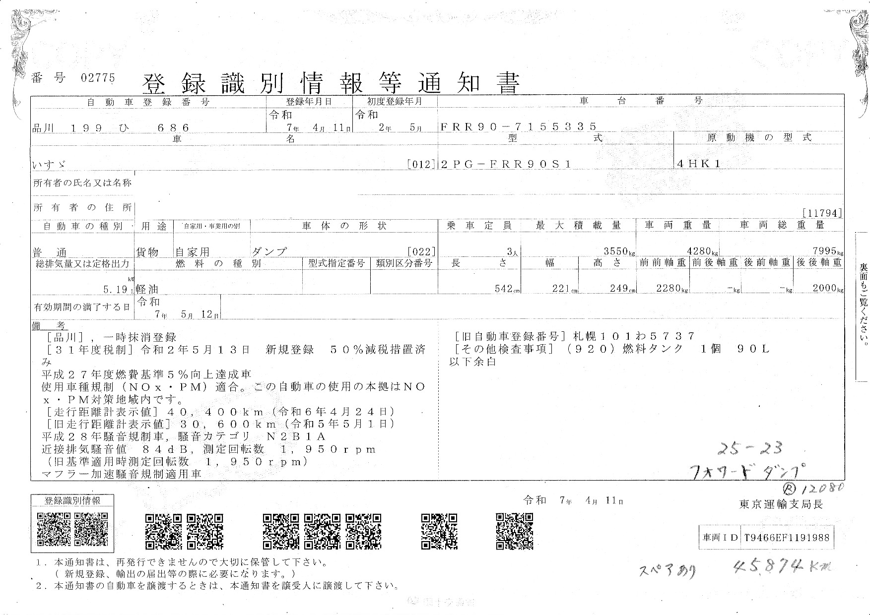 車台番号 FRR90-7155335