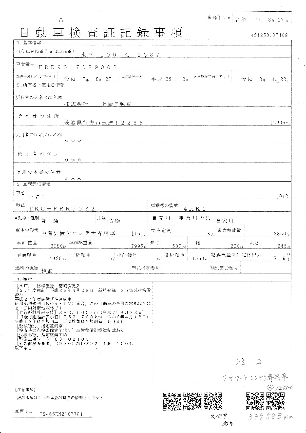 車台番号 | FRR90-7089002 |