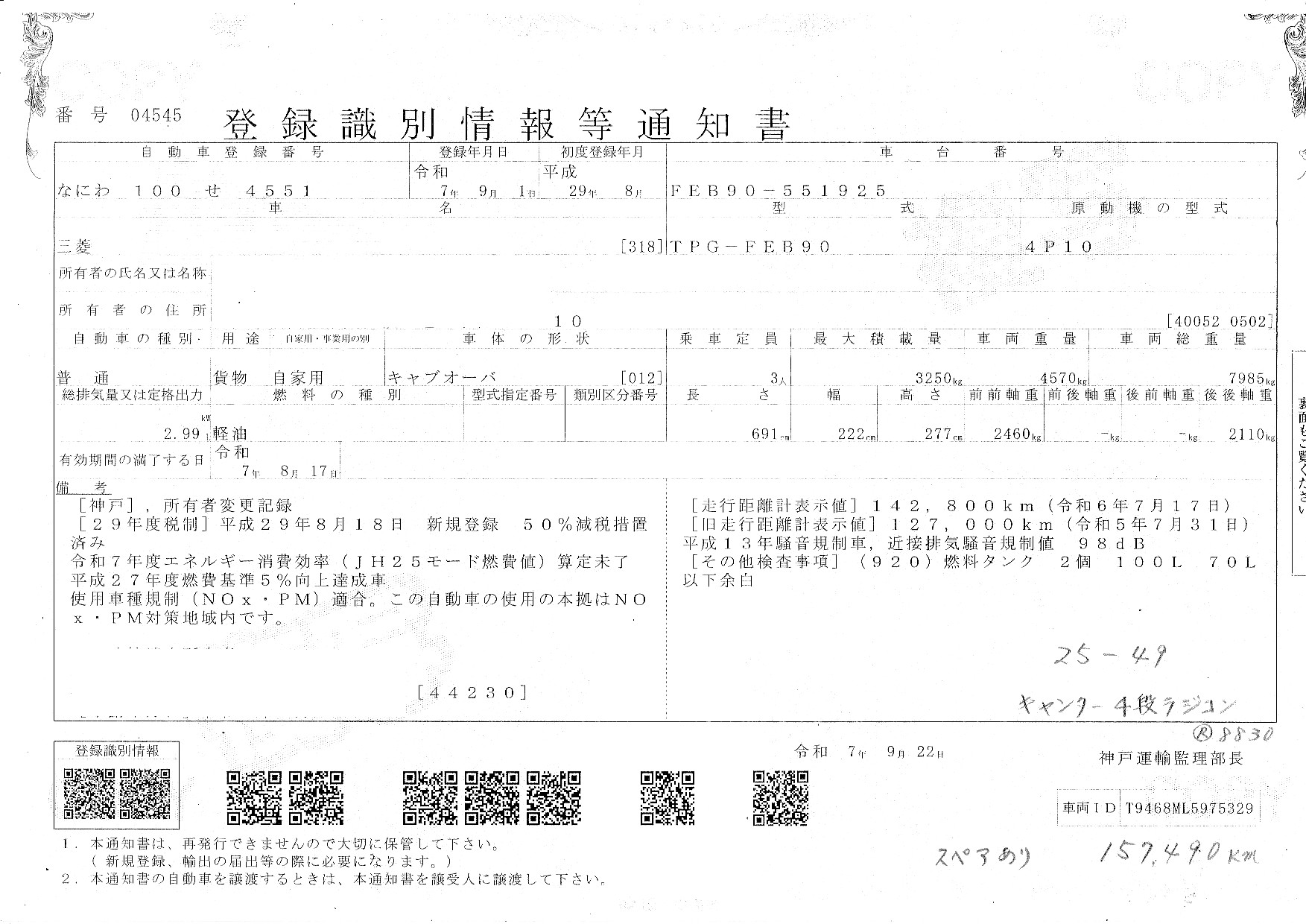 | 車検満了日 | 一時抹消 |