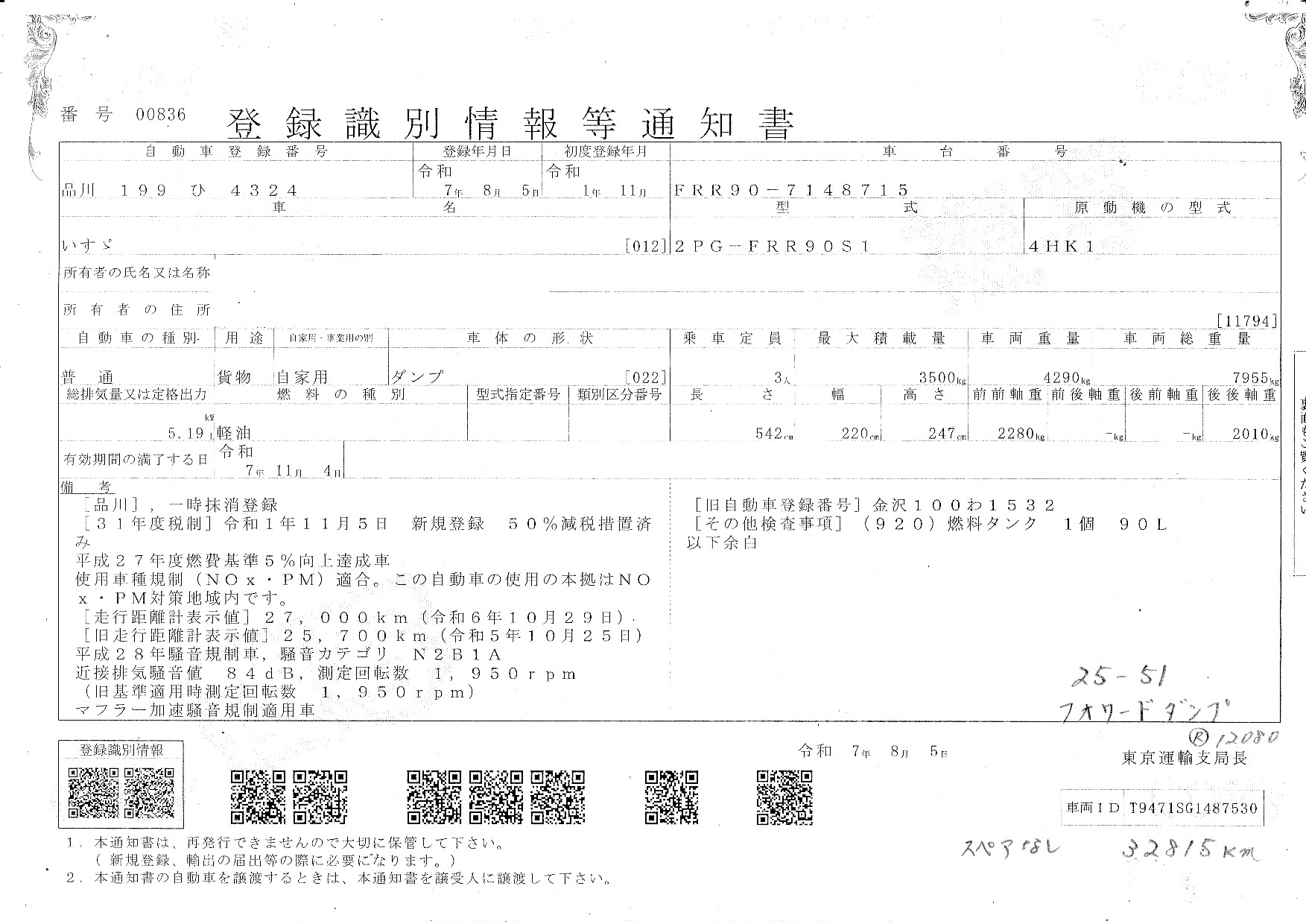 [25-51]R1年フォワードダンプ 3,5t 4万㎞ 2PG-FRR90S1