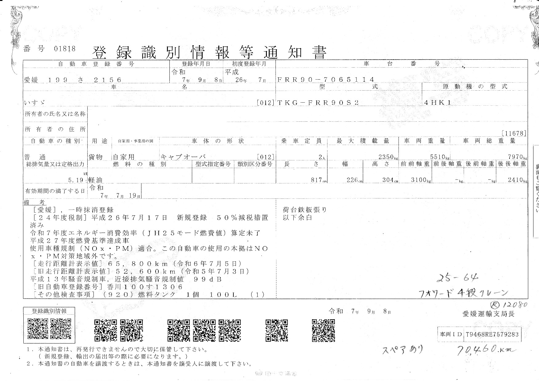 | 架装特記事項 | タダノ製4段クレーンフックインZE304 ラジコン付 ロープ通し穴4対 セイコーラック 床鉄板張 |