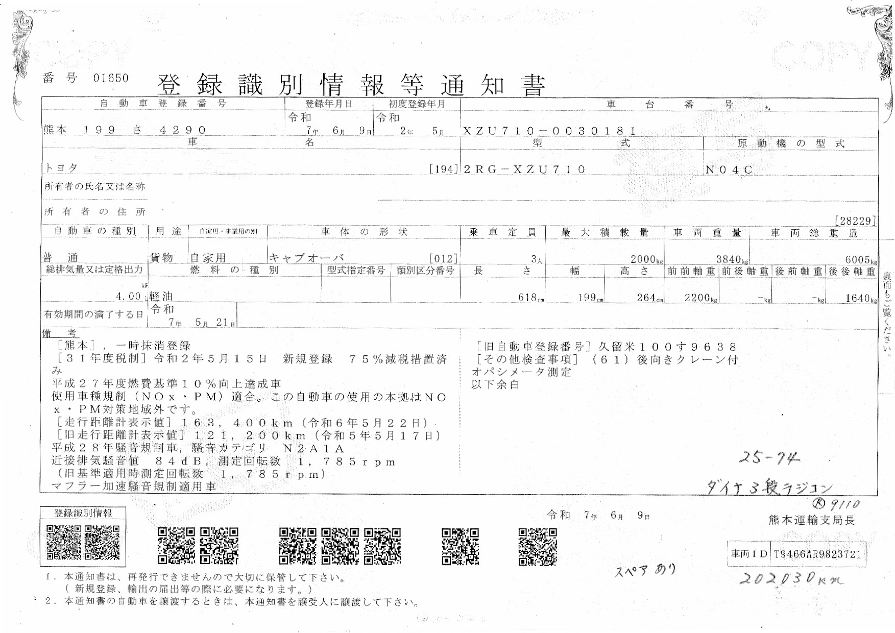 | 架装特記事項 | 古河ユニック製3段クレーンフックインURG263(20/03) ラジコン付 床鉄板張 |