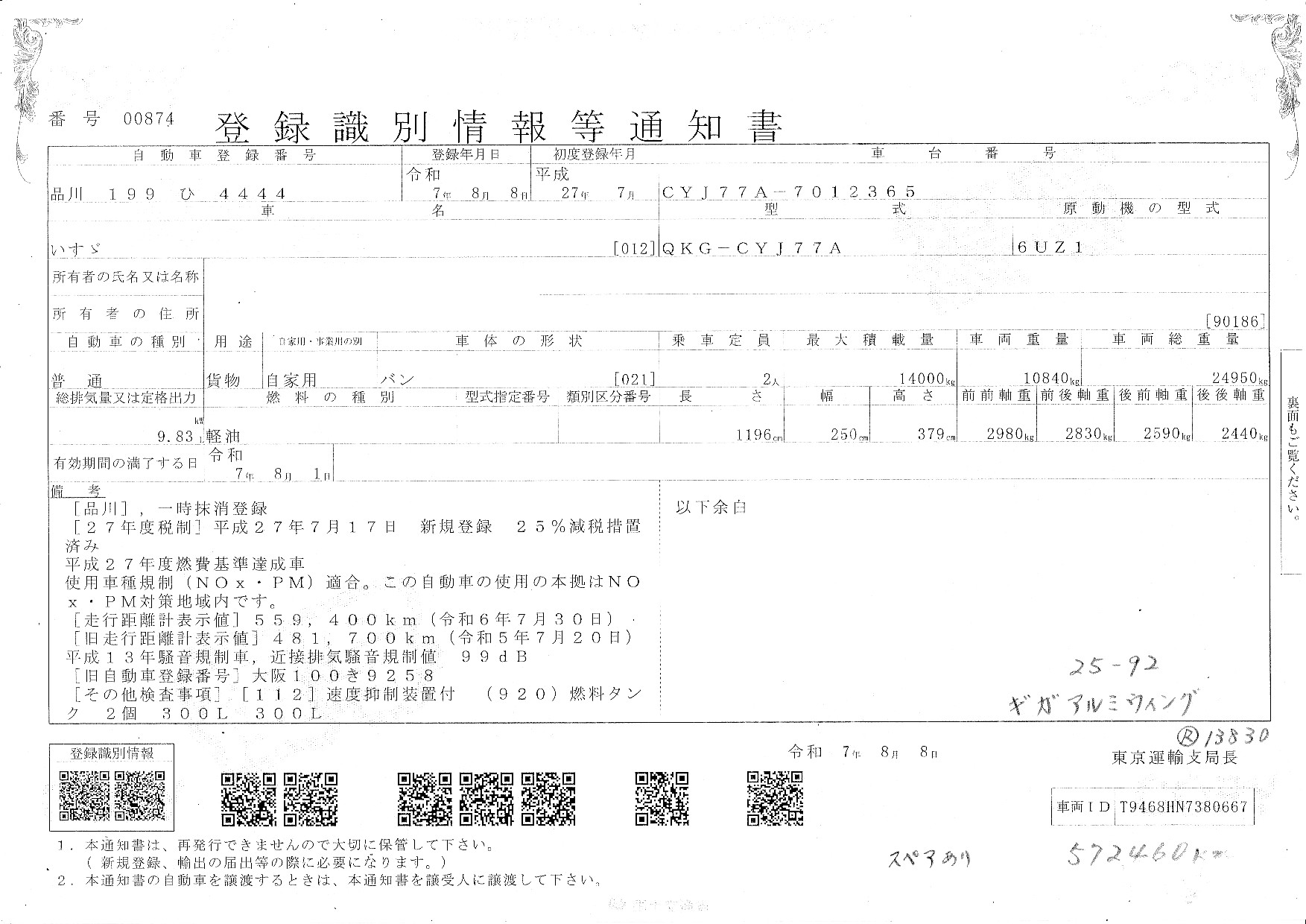 | 車検満了日 | 一時抹消 |