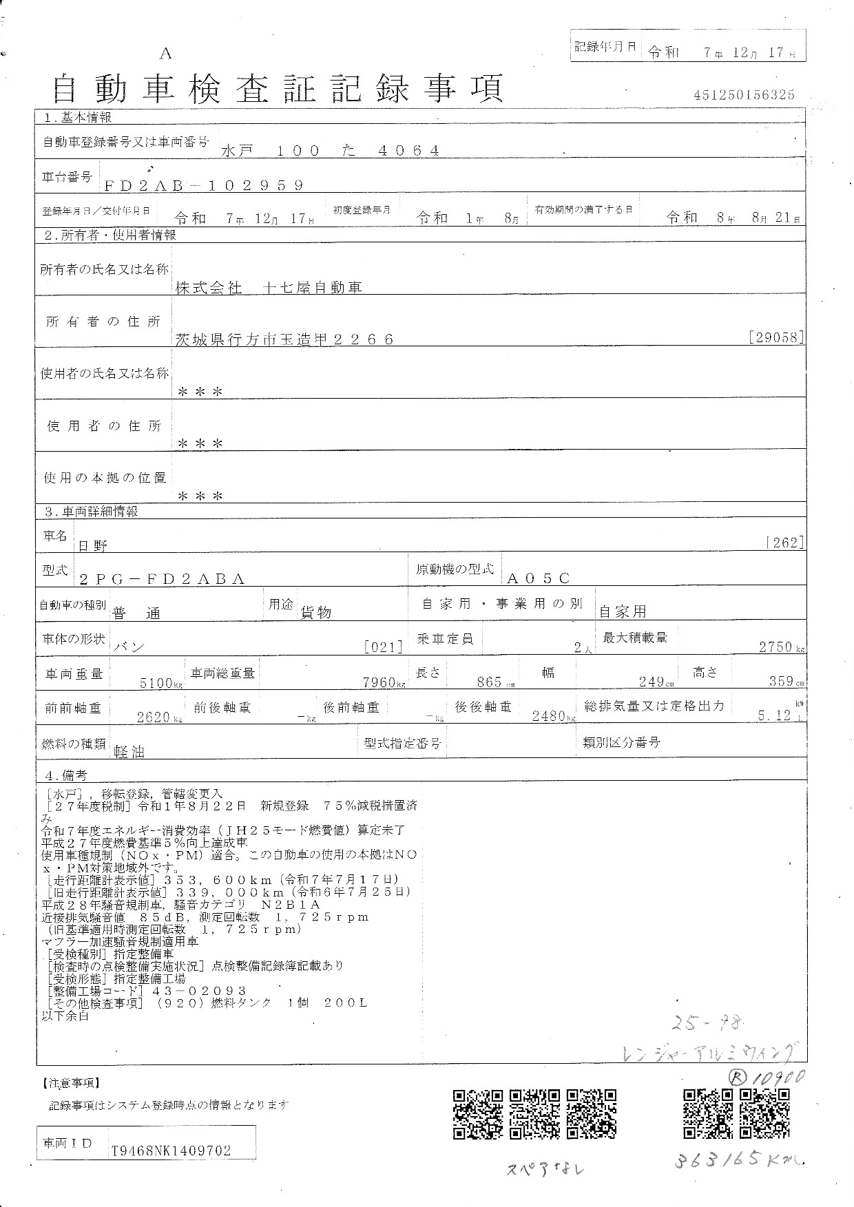 | 架装特記事項 | トランテックス製アルミウィング ラッシングレール2段 スタンション(穴加工) 床引出フック9対 |